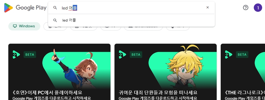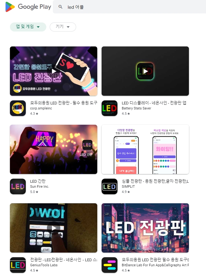 2. 플레이스토어 화면에서 우측 상단에 돋보기 모양의 아이콘을 찾으실 수 있을 거예요. 그걸 클릭하면 검색창이 열립니다. 이때 LED 어플 혹은 LED 전광판 같은 키워드를 입력하고 검색을 해보세요. 관련 앱들이 쭉 나오게 됩니다.