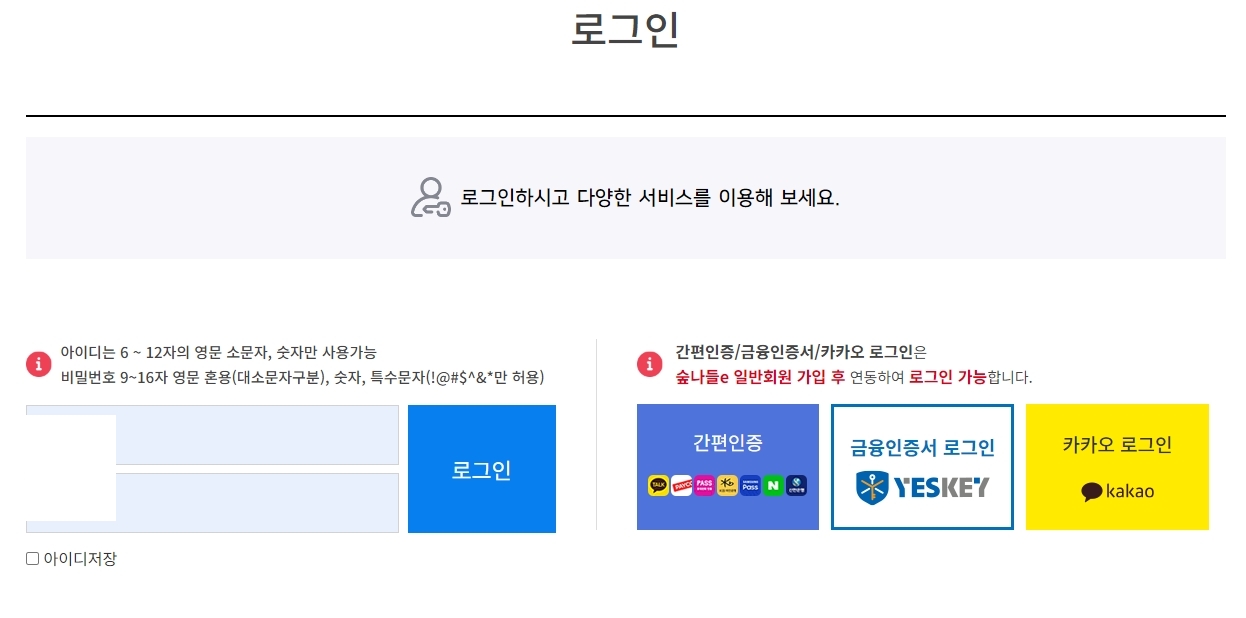 4. 로그인을 통해 다양한 서비스를 이용할 수 있어요. 회원가입을 완료하면 간편 인증이나 카카오 로그인 같은 방법을 통해 쉽게 접속할 수 있어요. 특히 자연휴양림 예약 시스템에서는 예약 후 로그인한 상태에서 예약 내역을 쉽게 관리할 수 있는 기능을 제공해요.