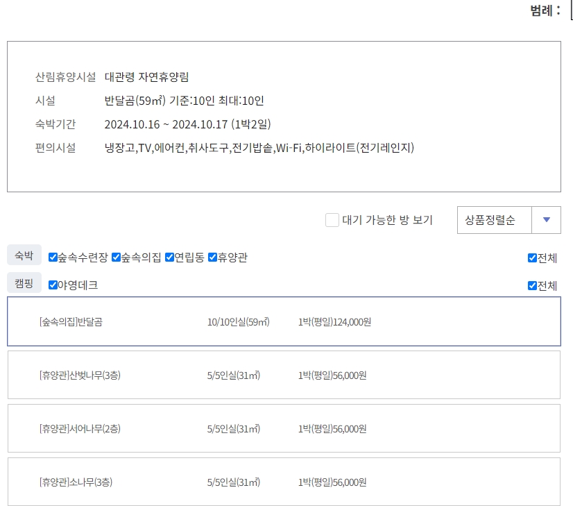 6. 원하는 숙박 시설을 선택할 때는 다양한 옵션이 있어요. 산림 휴양시설 목록에서는 숙박 시설과 캠핑 시설을 선택할 수 있어요. 각각의 시설마다 이용 가능한 인원과 가격 정보가 잘 정리되어 있어서 필요한 정보를 쉽게 찾을 수 있답니다. 이 시스템 덕분에 적절한 시설을 빠르게 선택할 수 있어요.