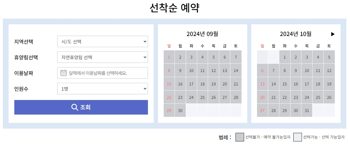 5. 선착순 예약 시스템을 통해 빠르게 예약할 수 있어요. 원하는 지역과 휴양림을 선택하고, 날짜와 인원을 입력한 후 조회 버튼을 누르면 예약 가능한 날짜를 확인할 수 있어요. 미리 계획을 세우는 데 아주 편리한 기능이에요.