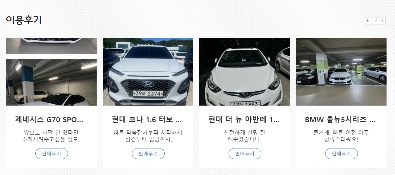 10. 이용 후기도 중요한 요소인데, 실 구매자들의 후기가 매우 상세하게 제공되고 있어요. 제네시스 G70, 현대 코나, BMW 5시리즈 등 다양한 차종의 구매 후기를 통해, 다른 사용자들이 차량을 구매할 때 어떤 점을 고려했는지 참고할 수 있죠. 후기를 읽으면서 실제 경험을 바탕으로 차를 선택하는 데 큰 도움을 받을 수 있어요.