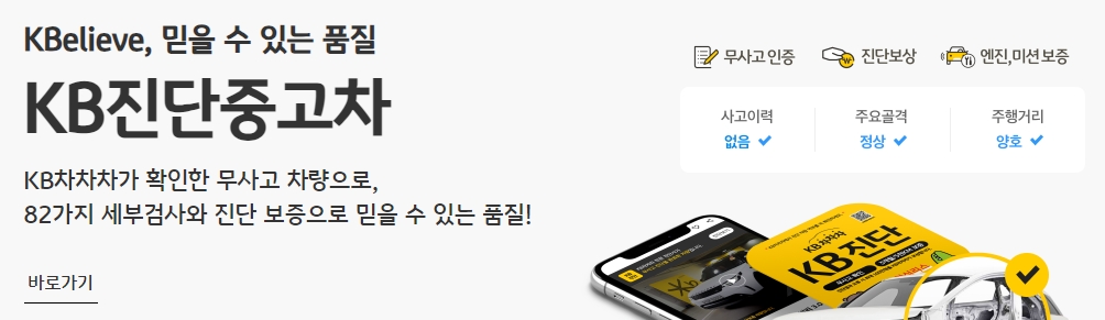 9. KB 진단 중고차 코너에서는 무사고 인증 차량만을 다루고 있어요. 총 82가지 세부 검사를 통해 사고력 없는 차량들만 선별해서 판매하고 있어 신뢰할 수 있어요. 차량의 주요 골격이나 주행거리 등도 진단 보증이 되어 있어서, 구매자가 안심하고 차량을 선택할 수 있는 환경을 제공해 주고 있어요.
