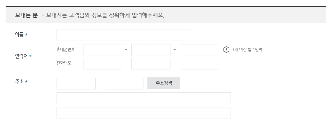 그 다음에는 보내는 사람과 받는 사람의 이름, 연락처, 주소를 입력해야 합니다. 여기서 선택 입력 항목은 굳이 작성하지 않아도 되며, 필요에 따라 미동의 체크를 할 수 있습니다.