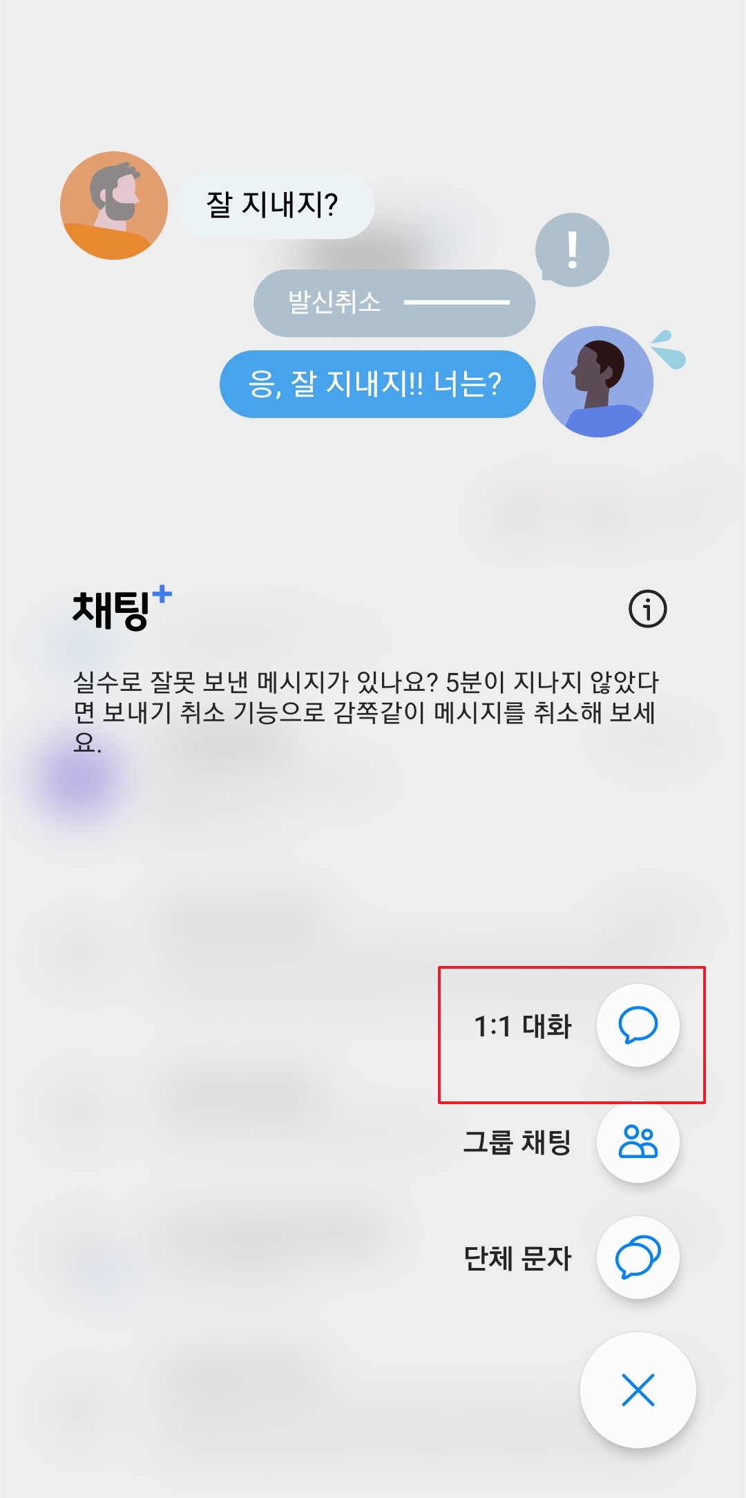3. 다양한 채팅 방식 중에서 1:1 대화를 선택합니다. 참고로 실수로 잘못 보낸 문자는 보내기 취소 기능을 통해 5분 안에 취소할 수 있으니, 급한 실수를 피할 수 있어요.