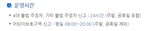 4. 운영시간은 다양합니다. 일반적인 주정차 신고는 24시간 가능하지만, 어린이 보호구역은 평일 08시부터 20시까지만 신고할 수 있습니다. 꼭 시간대를 확인해 주세요!