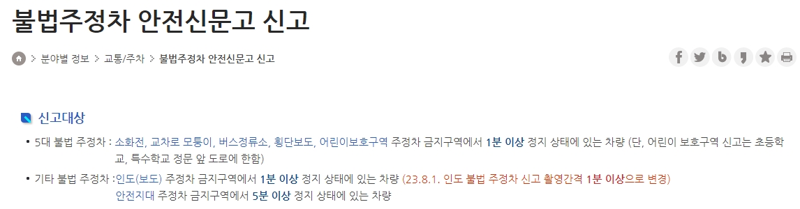 3. 신고 대상은 다양한 종류가 있습니다. 예를 들어, 인도에서 1분 이상 정지하거나, 안전지대에서 5분 이상 정지하는 차량이 이에 해당됩니다. 이러한 기준을 잘 확인하고 신고하세요!