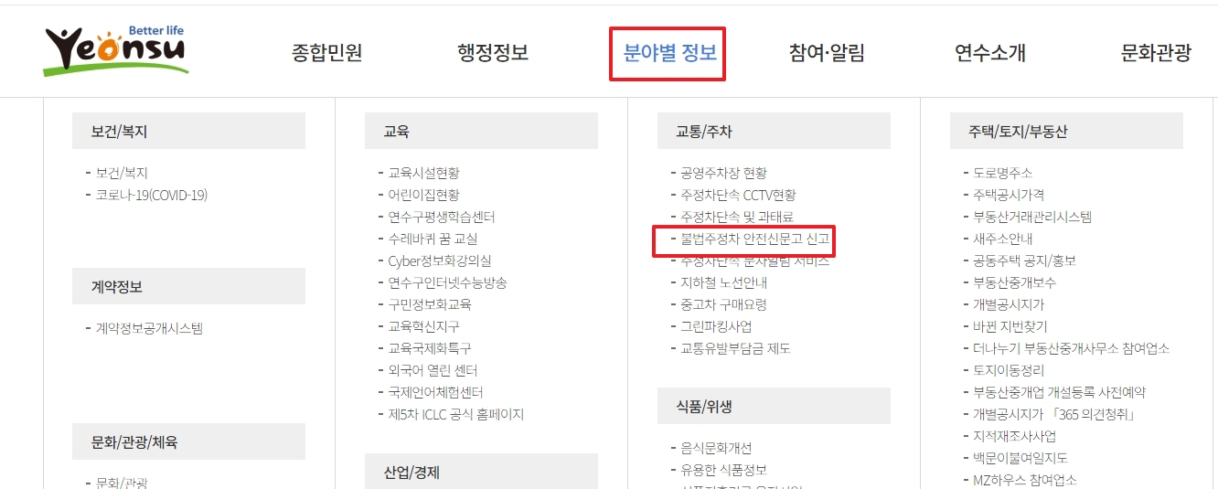 2. 상단 메뉴에서 분야별 정보 - 교통/주차 - 불법주정차 안전신문고 신고를 클릭하세요. 이곳에서 신고하는 방법과 다양한 정보를 쉽게 찾을 수 있습니다.