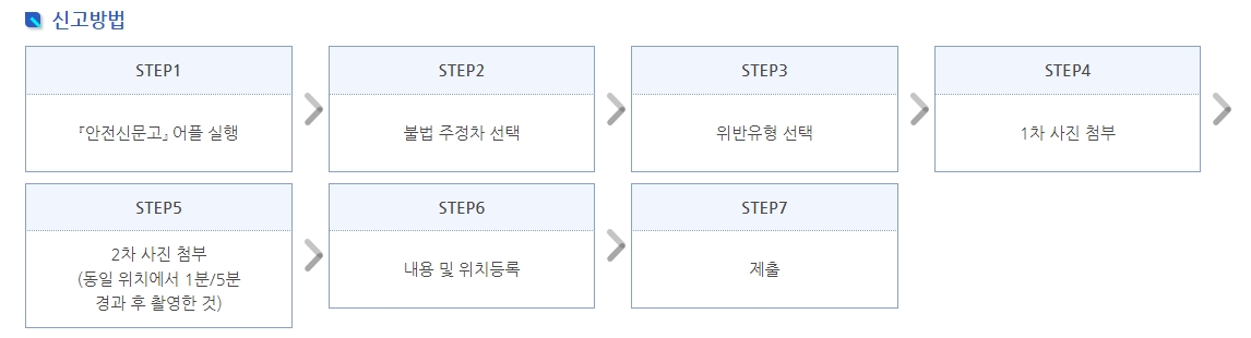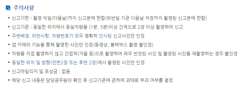 7. 신고 기한은 촬영 다음날까지이며, 사진에는 주변 배경과 위반 사항, 차량번호가 명확히 보이도록 찍어야 합니다. 기타 주의사항도 확인하고 신고를 진행해 주세요!