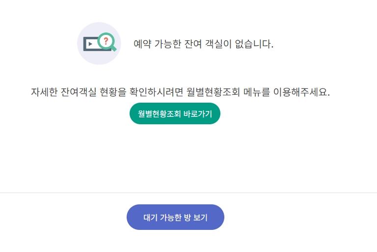 2. 사용자는 예약 가능한 객실이 없을 경우 대기 가능한 방을 확인하거나 월별 현황 조회를 통해 잔여 객실 정보를 확인할 수 있습니다. 예약 가능한 객실이 없는 상황에서도 여러 대체 방안을 제공하고 있어, 원하는 날짜에 맞는 객실을 찾기가 수월합니다.