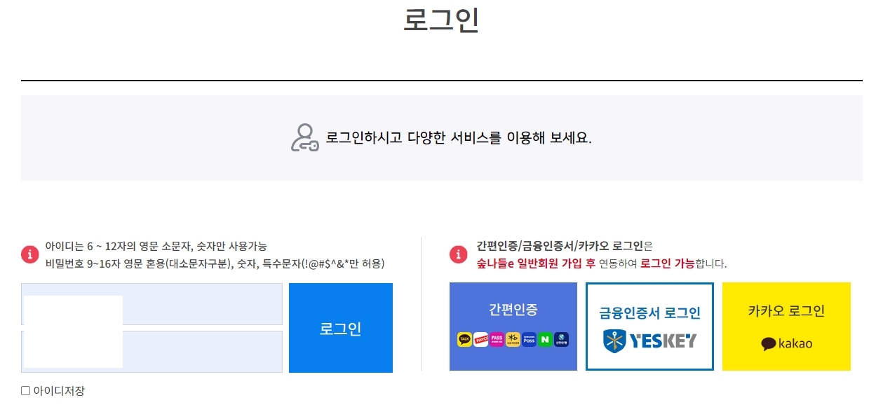4. 숲나들e 홈페이지에서는 회원 로그인 후 더 많은 서비스와 혜택을 누릴 수 있습니다. 간편 인증과 금융 인증서, 카카오 로그인을 통한 간편 로그인 서비스도 제공되며, 회원가입 후에는 더욱 편리하게 서비스를 이용할 수 있습니다. 로그인 후에는 자신의 예약 내역을 관리하거나, 다양한 혜택을 누릴 수 있습니다.