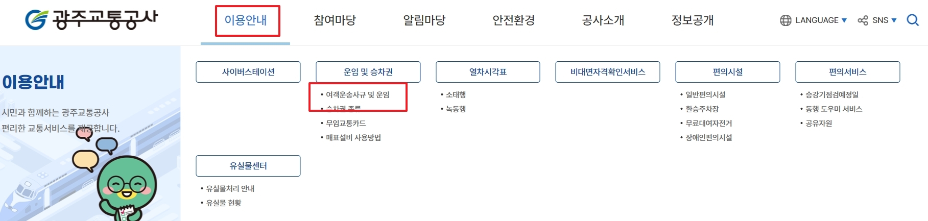 3. 이용 안내 메뉴에서는 광주교통공사의 다양한 서비스와 함께, 여객 운송 사규 및 운임 정보를 확인할 수 있어요. 이곳에서 운임에 대한 세부사항을 확인할 수 있을 뿐만 아니라, 승차권 종류, 교통 카드 사용법, 매표설비 사용법 등도 모두 안내하고 있답니다. 교통 이용에 대한 기본적인 정보부터 심화된 사항까지 제공되니 처음 이용하는 사람들도 쉽게 정보를 찾을 수 있어요.