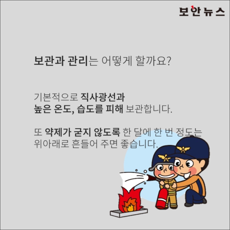 6. 소화기를 사용한 후에는 소화기 보관에도 신경을 써야 합니다. 직사광선과 습기가 많은 곳을 피하고, 약제가 굳지 않도록 한 달에 한 번 정도 소화기를 위아래로 흔들어주는 것이 좋습니다.