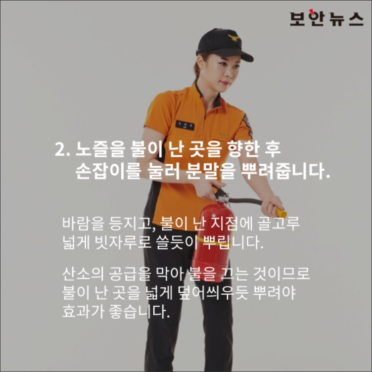 5. 분말을 분사할 때는 넓게 퍼지도록 빗자루로 쓸듯이 쏴야 합니다. 산소를 차단해 불을 진압하는 원리이기 때문에, 불이 난 지점을 중심으로 넓게 뿌려야 효과가 큽니다.