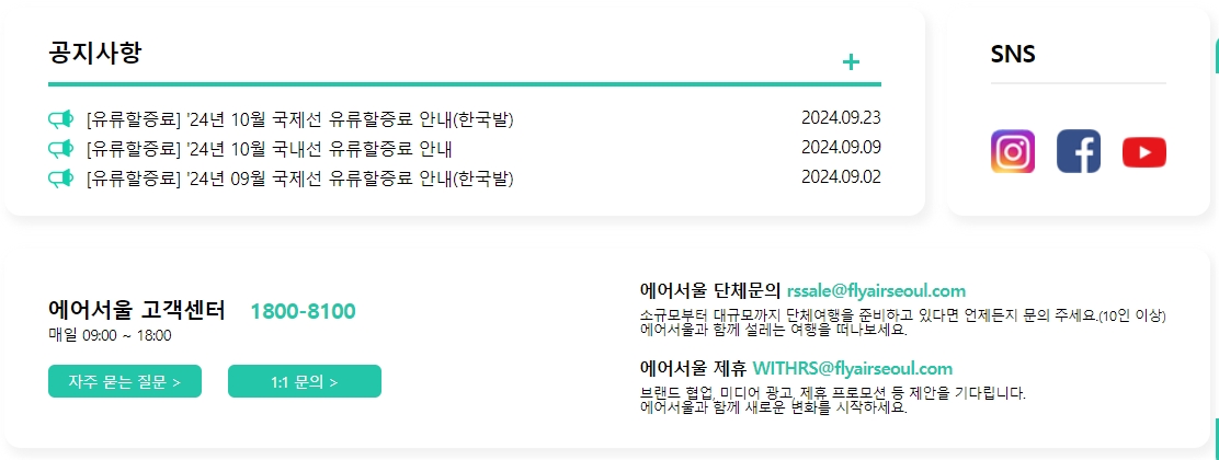 8. 공지사항에서 유류할증료 안내와 같은 중요한 정보를 확인할 수 있어요. 또한, 에어서울 고객센터와 연락할 수 있는 방법도 제공되어 있어서 궁금한 점이나 문제가 생겼을 때 바로 문의할 수 있어요. 다양한 채널로 에어서울과 소통할 수 있는 점이 매우 편리하죠.
