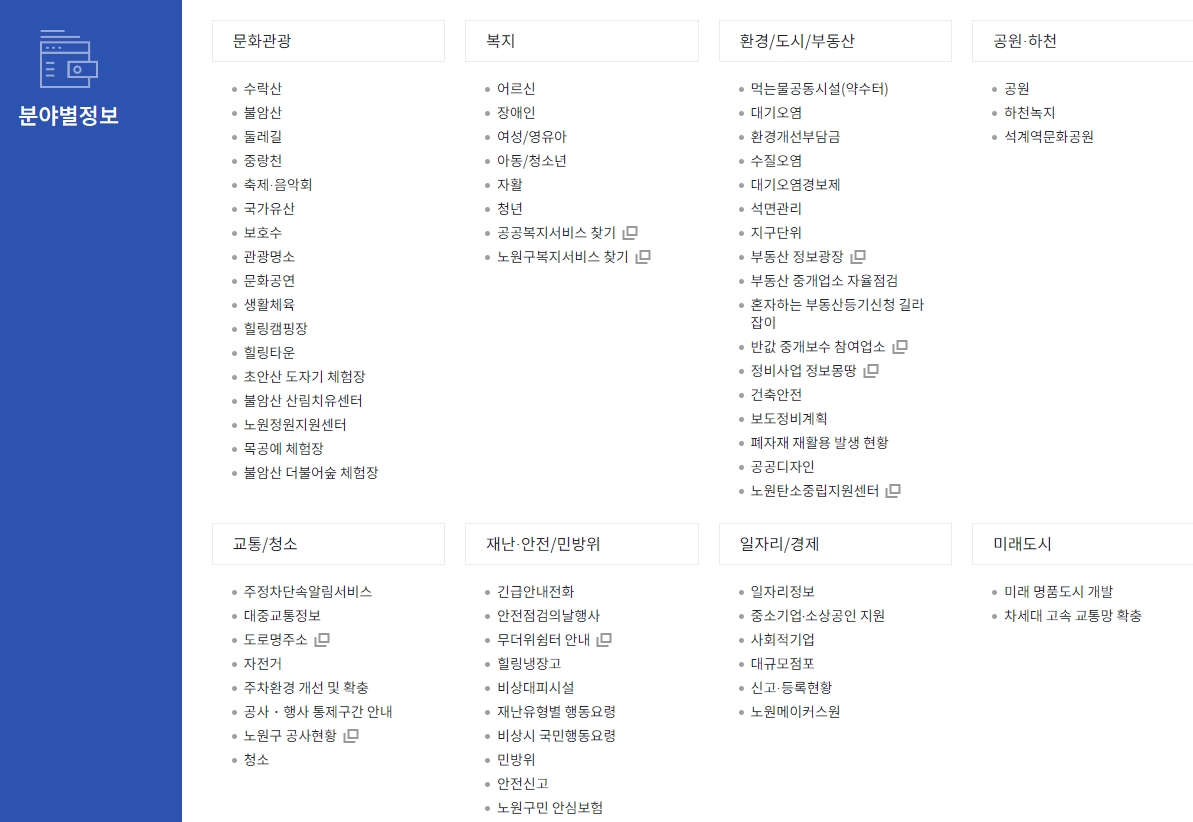 5. 분야별 정보 메뉴에서는 문화관광, 복지, 환경/도시/부동산, 교통/청소, 재난/안전/민방위와 같은 카테고리별로 정보를 제공합니다. 이곳에서는 문화유산 및 축제 정보뿐 아니라, 대기오염 경보제, 교통정보, 안전사고 신고 방법 등 생활에 필요한 다양한 정보들을 손쉽게 찾을 수 있습니다.