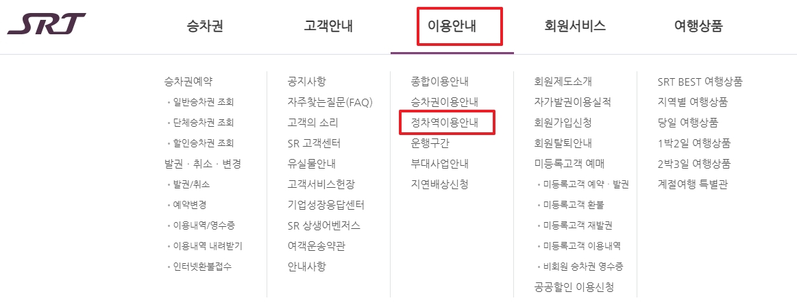 2. 홈페이지 상단 메뉴에서 ‘이용안내’를 선택한 후, 정차역 이용안내 섹션을 클릭합니다. 이 메뉴에서는 SR이 운영하는 각 정차역에 대한 정보를 제공하고 있어, 수서역을 포함한 다양한 역에 대한 정보를 확인할 수 있습니다. 이를 통해 주차장 정보뿐만 아니라 역 시설 및 편의시설까지 파악할 수 있습니다.