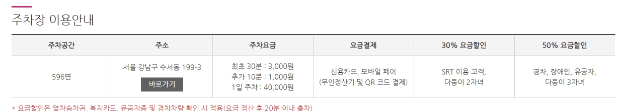3. 정차역 이용안내에서 수서역을 선택하면 수서역에 대한 다양한 정보가 제공됩니다. 주차장 요금부터 시설 정보, 주변 교통편 등에 대한 정보를 확인할 수 있으며, 수서역 주차장의 높은 요금과 관련된 상세 안내도 확인할 수 있습니다. 처음 30분 주차에 3,000원이 부과되고, 이후 10분마다 1,000원이 추가됩니다. 하루 주차 요금은 40,000원에 달하며, SRT 이용객은 30% 할인을 받을 수 있습니다.