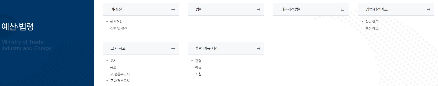 6. 예산과 법령에 대한 정보도 상세하게 제공되어 투명한 예산 관리가 이루어지고 있습니다. 예산 메뉴에서는 예산 편성과 집행, 결산 정보를 제공하여 국민들이 국가 예산의 흐름을 쉽게 파악할 수 있게 합니다. 또한 법령과 관련된 최신 개정 정보와 행정 예고도 제공되어 법률에 대한 접근성을 높였습니다. 관련 고시와 공고 사항은 주기적으로 업데이트되며, 국민들이 법령 정보를 쉽게 찾을 수 있도록 다양한 검색 기능을 제공합니다.