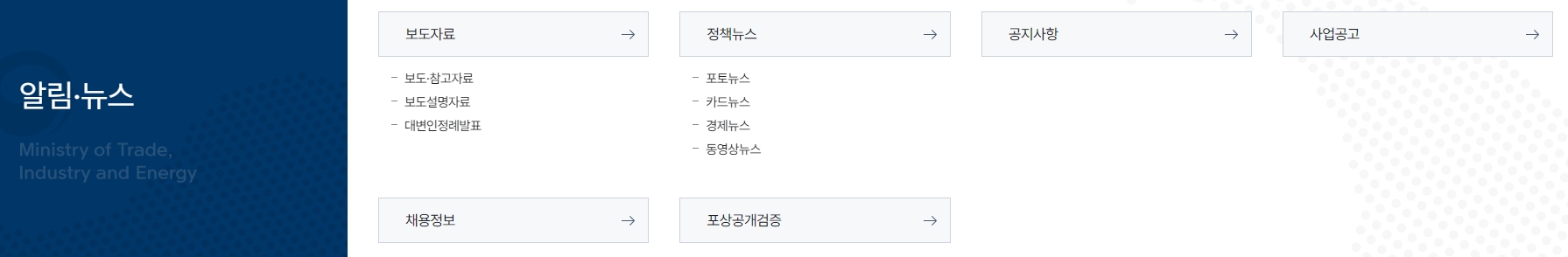 9. 보도 자료와 함께 국민들이 산업부의 정책과 활동에 대해 알 수 있도록 다양한 정보가 제공됩니다. 보도 자료 메뉴에서는 주요 정책 발표와 관련된 보도자료들이 제공되며, 정책에 대한 상세 설명 자료도 제공됩니다. 이로써 국민들이 정부 정책에 대한 이해도를 높일 수 있도록 돕습니다. 산업부의 최신 소식을 한눈에 파악할 수 있는 이 메뉴는 국민들이 필요한 정보를 쉽고 빠르게 접할 수 있게 해줍니다.