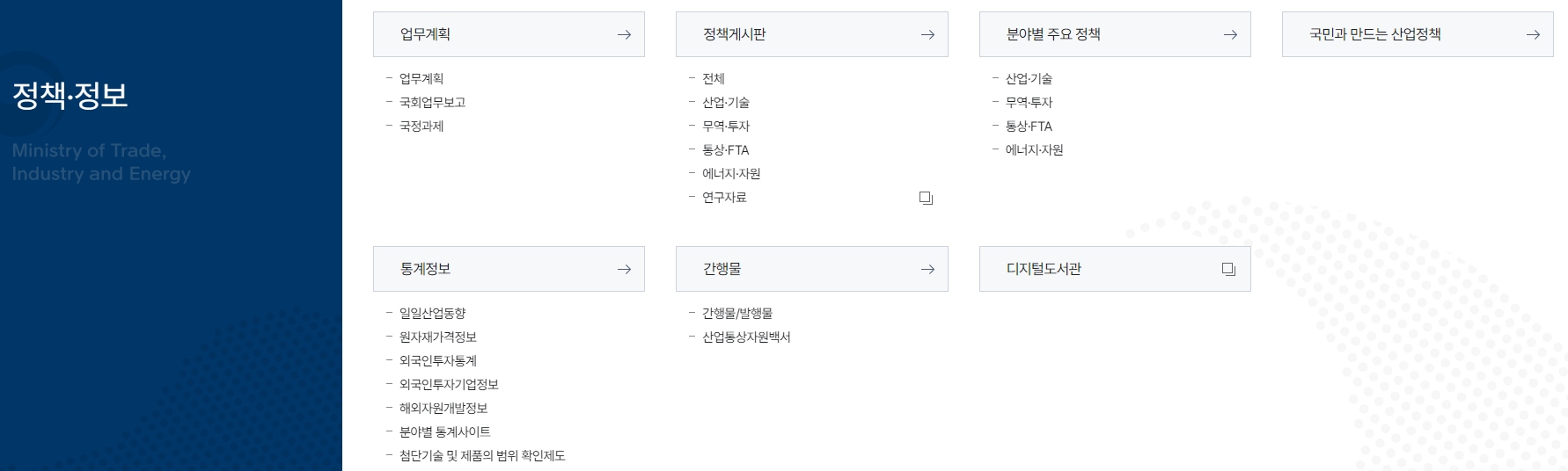 5. 산업과 무역, 에너지 관련 주요 정책들이 한눈에 정리되어 있으며, 다양한 통계 자료도 확인 가능합니다. 정책 정보 메뉴에서는 산업 정책, 기술, 에너지 자원 등 분야별 주요 정책 정보가 제공됩니다. 또한, 외국인 투자 통계부터 원자재 가격 정보, 해외 자원 개발 현황 등 상세한 통계 자료가 정리되어 있어, 해당 분야에 관심이 있는 국민들이 쉽게 접근하고 정보를 확인할 수 있게 합니다. 특히 통상 FTA 관련 정보도 업데이트 되어 있어 무역과 관련된 최신 협정 현황도 쉽게 확인할 수 있습니다.