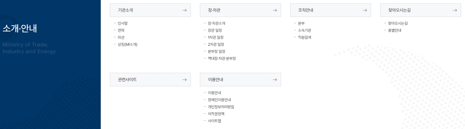 7. 기관 소개와 관련된 다양한 정보와 함께 산업부의 주요 활동과 역할을 알 수 있습니다. 기관 소개 메뉴에서는 산업부의 연혁과 미션, 그리고 각종 기관의 역할 및 주요 부서 정보를 확인할 수 있습니다. 장관 및 차관의 일정과 행사 관련 정보도 쉽게 찾아볼 수 있으며, 역대 장관 및 본부장의 활동도 정리되어 있습니다. 또한, 각종 관련 사이트도 연결되어 있어 국민들이 필요한 다른 부처나 기관 정보도 손쉽게 접근할 수 있습니다.
