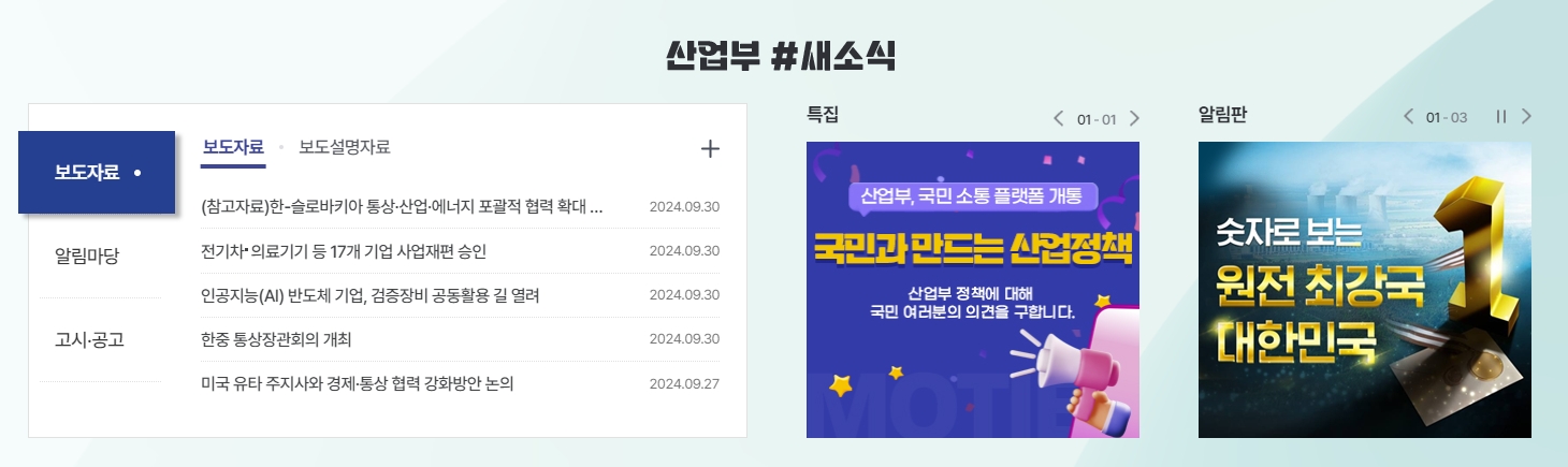 4. 산업통상자원부의 최신 정책 정보와 알림 뉴스 등을 확인할 수 있는 페이지도 제공됩니다. 이 메뉴에서는 보도자료를 통해 산업통상자원부의 최신 정책 발표 및 설명자료를 확인할 수 있으며, 정책 뉴스는 포토, 카드, 경제, 동영상 뉴스 형태로 제공되어 사용자 편의성을 높였습니다. 이를 통해 산업 정책에 대한 최신 정보를 빠르게 파악하고 필요한 내용을 확인할 수 있습니다. 또한, 중요한 공지사항이나 사업 공고도 이 메뉴에서 확인할 수 있어 국민들이 참여할 수 있는 다양한 기회를 제공하고 있습니다.