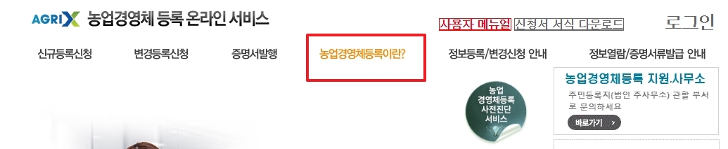 2. 상단 메뉴에서 농업경영체 등록을 클릭하면 관련 절차와 조건에 대한 설명을 볼 수 있습니다. 등록에 필요한 정보와 신청 방법이 상세하게 안내되어 있습니다.