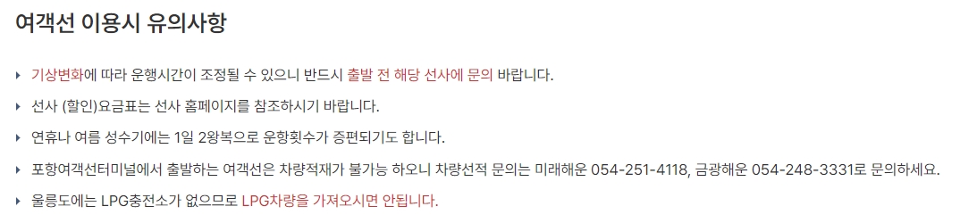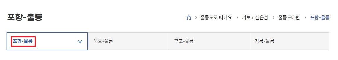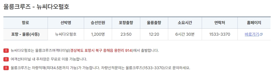 3. 울릉도 배편 정보를 확인하려면 상단의 ‘울릉도 배편’을 클릭하면 됩니다. 여기에는 포항-울릉도를 연결하는 다양한 배편 시간표와 함께 승선 인원, 출항 시간, 소요 시간 등의 정보를 확인할 수 있어요. 배편의 정보는 여행 일정 계획에 큰 도움이 될 거예요.