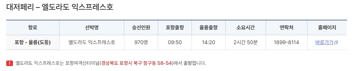 4. 포항에서 울릉도로 운항되는 대저페리 - 엘도라도 익스프레스호의 배편 시간표를 보면, 오전 9시 50분에 포항에서 출발하여 14시 20분에 울릉도에 도착해요. 소요 시간은 약 2시간 50분이며, 최대 승선 인원은 970명입니다. 엘도라도 익스프레스호는 포항여객선터미널에서 출발합니다.