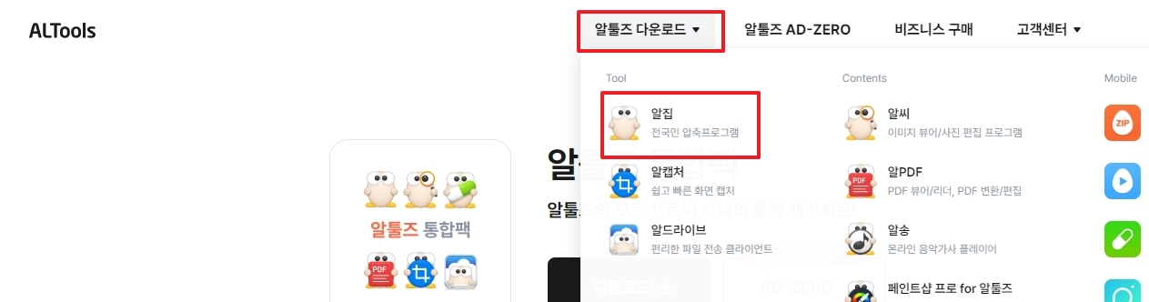 2. 상단의 알툴즈 다운로드 메뉴에서 알집을 클릭합니다. 여기서 다양한 버전의 알집을 확인할 수 있습니다.