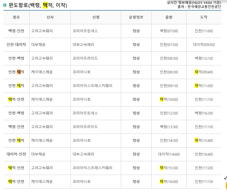 2. 연안여객터미널 메뉴에서는 덕적도를 포함한 여러 섬으로 가는 항로의 운항 상황을 확인할 수 있습니다. 실시간 입출항 정보로 배의 출발 및 도착 여부를 신속하게 파악할 수 있어요.