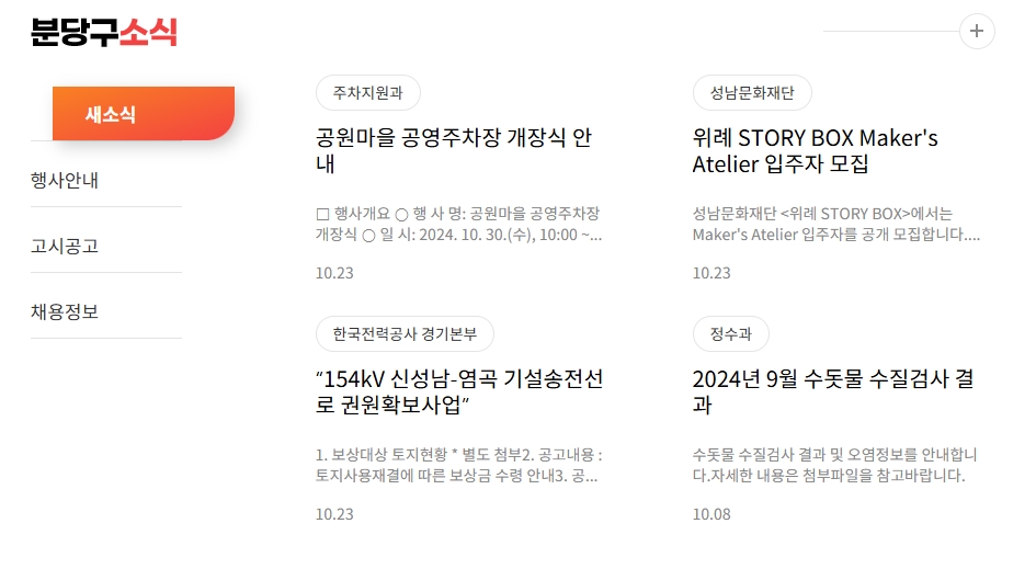 9. 마지막으로, 분당구청의 새 소식 게시판에서는 지역 행사, 공지, 채용 정보 등을 확인할 수 있으며, 주민들이 중요한 소식들을 놓치지 않도록 알림 서비스를 제공합니다.