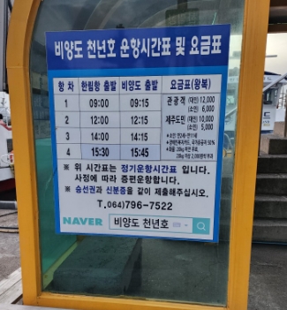 비양도로 가는 천년호의 배편 시간표는 다음과 같아요. 첫 번째 배는 오전 9시에 한림항을 출발해 9시 15분에 비양도에 도착합니다. 아침 시간대에 출발해 하루를 길게 활용하고 싶은 여행자들에게 적합한 일정이에요.