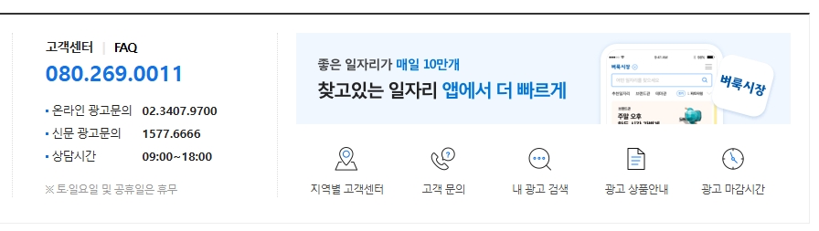 2. 화면 상단에는 고객센터 번호가 명확하게 나와 있어 사용자가 필요한 도움을 빠르게 받을 수 있습니다. 온라인 광고 문의는 02-3407-9700, 신문 광고 문의는 1577-6666번으로 연락하면 됩니다. 고객센터 운영 시간은 오전 9시부터 오후 6시까지이며, 토요일과 공휴일에는 운영하지 않습니다. 또한, 벼룩시장 앱에서는 매일 10만 개 이상의 새로운 일자리가 게시되어, 구직자들이 원하는 직업을 더욱 신속하게 찾아볼 수 있습니다.