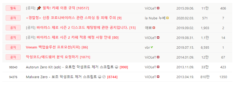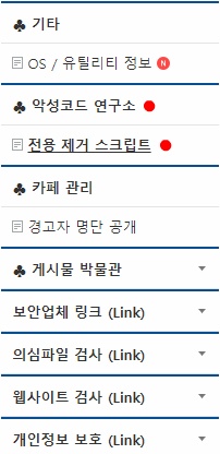 카페의 좌측 메뉴를 내리다 보면 mzk악성코드 연구소 - 전용 제거 스크립트mzk 섹션이 있습니다. 여기에서 사용자들이 필요로 하는 다양한 스크립트를 찾을 수 있습니다.
