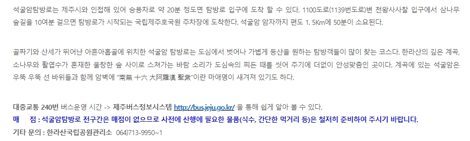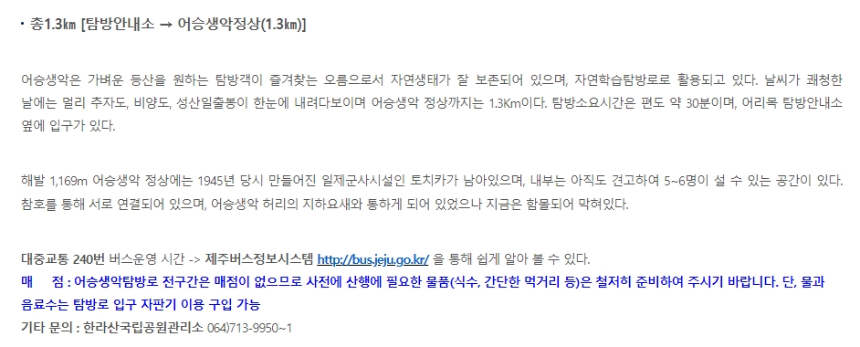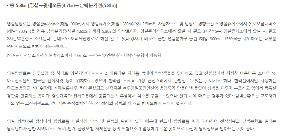 추가로 각 코스별로 가장 아래쪽에 적혀있는 내용중에서는, 탐방로의 난이도, 대피소 위치, 매점 정보, 화장실 위치, 교통 정보, 그리고 기타 문의 사항에 대한 연락처 등이 있습니다. 특히, 영실탐방로의 난이도는 구간별로 다르며, 제주버스정보시스템에서도 대중교통 정보를 확인할 수 있었습니다.