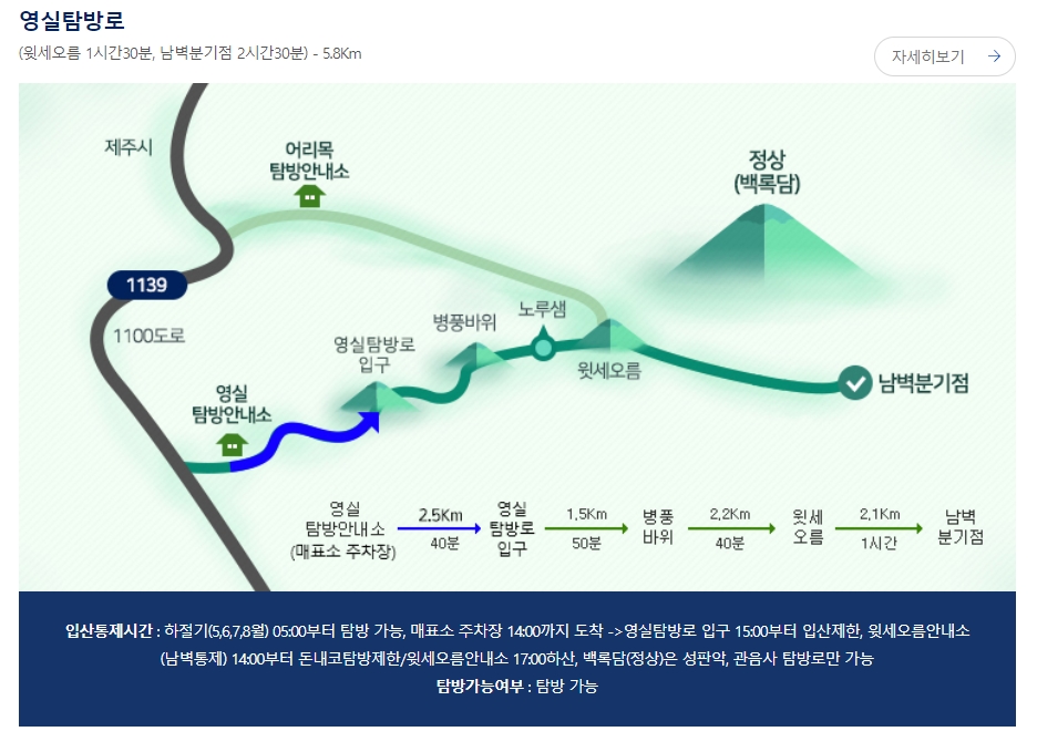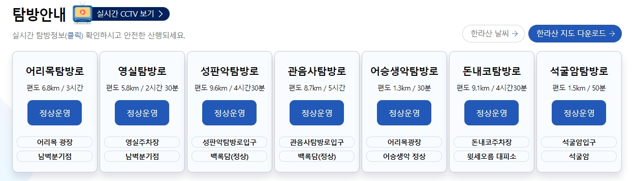 한라산 국립공원 홈페이지에 접속하면 탐방안내 메뉴에서 현재 코스의 운영 상태, 거리, 예상 소요 시간 등의 정보를 확인할 수 있습니다.