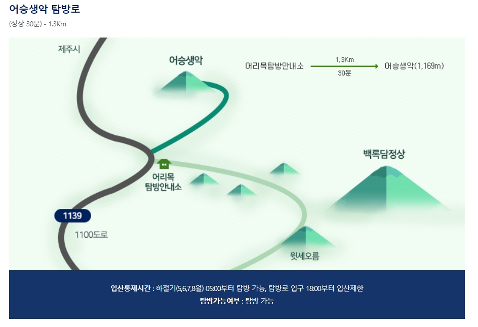 어승생악 탐방로의 정보를 확인해보니, 정상까지의 소요시간은 약 30분이며, 전체 거리는 1.3Km입니다.
