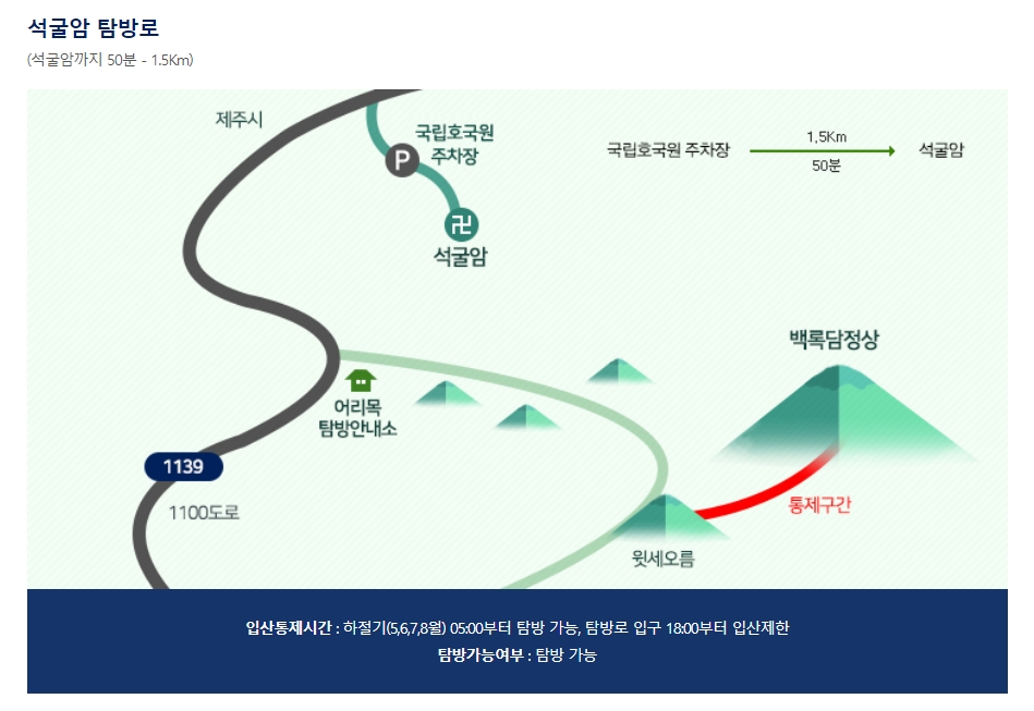 석굴암탐방로는 제주시와 가까워, 승용차로 20분만에 도착할 수 있습니다. 특히, 이 탐방로는 도심에서 벗어나 가볍게 등산을 즐기고자 하는 사람들에게 인기가 있습니다.
