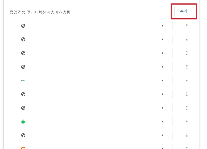 7. 특정 웹사이트만 팝업을 허용하고 싶다면 아래쪽에 있는 사이트 추가 옵션을 사용하면 됩니다. 자주 방문하는 사이트를 미리 추가해두면 매번 팝업 허용 여부를 설정할 필요가 없으니 편리해요.