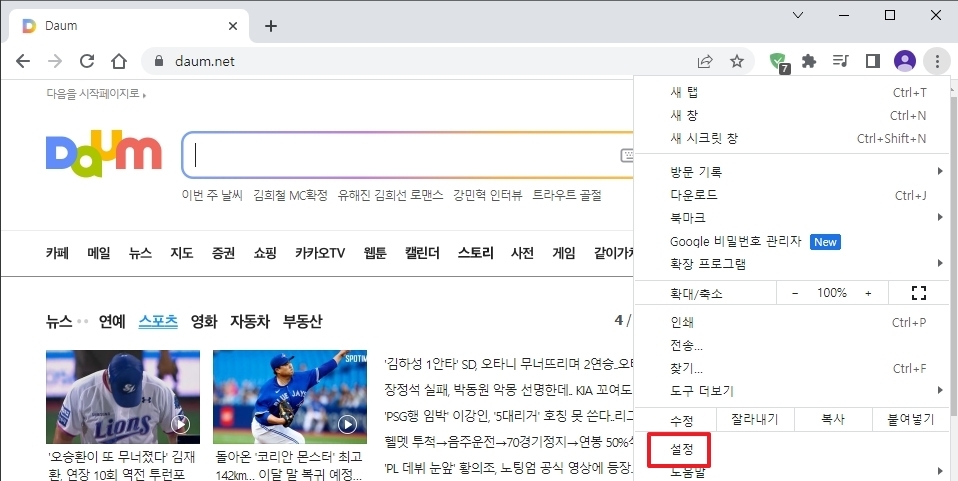 2. 메뉴가 열리면 설정을 클릭합니다. 이 메뉴에서는 브라우저의 개인 맞춤 설정과 보안 관련 기능들을 관리할 수 있어요. 팝업 차단 해제도 여기서 가능합니다.