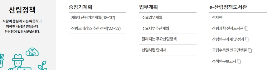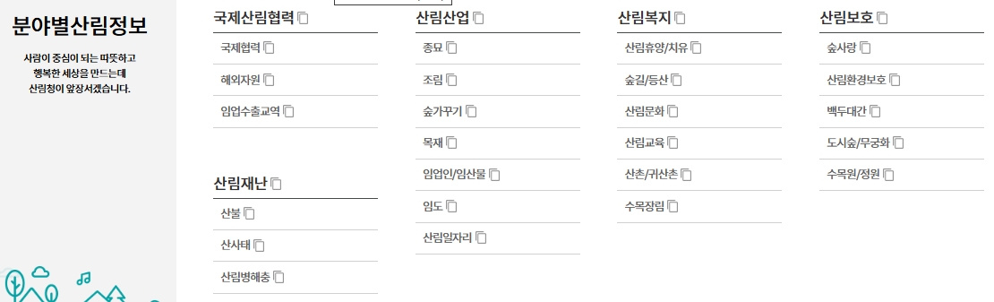 5. 분야별 산림 정보 메뉴로 이동합니다. 국제 산림 협력, 산림 재난, 산림 산업, 산림 복지, 산림 보호 등 다양한 분야의 산림 정보를 제공하여 산림에 관한 이해를 높이고 정책적 대응 방안을 제시합니다.