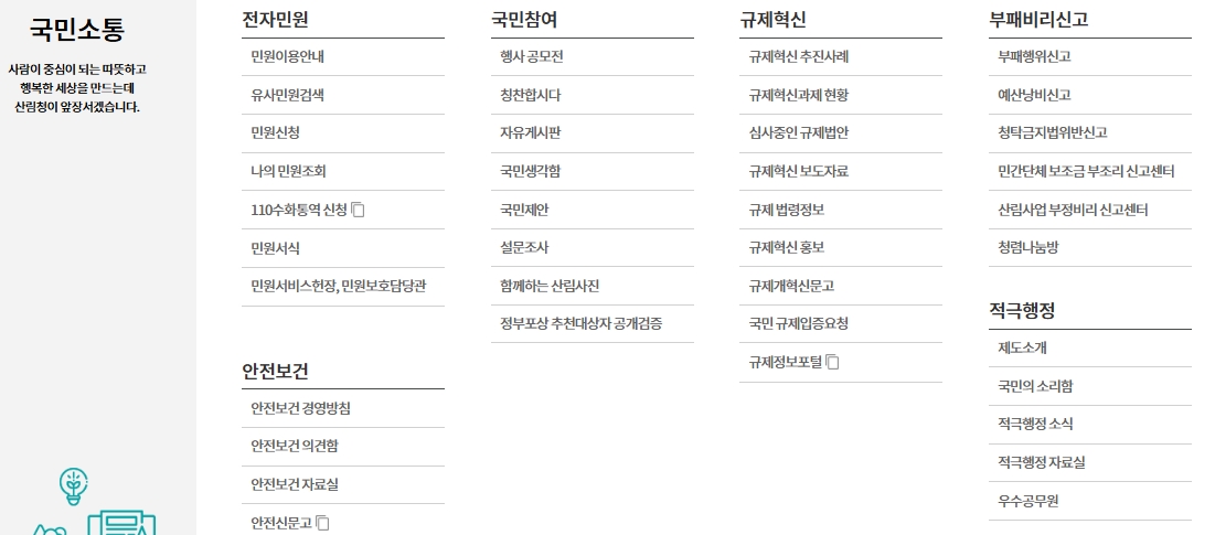 7. 국민 소통 메뉴로 이동합니다. 전자 민원, 규제 혁신, 부패 비리 신고, 안전 보건 정보 등 다양한 국민 소통 창구를 마련하여 국민들의 목소리를 반영하고, 산림 관련 민원을 처리할 수 있도록 지원합니다.