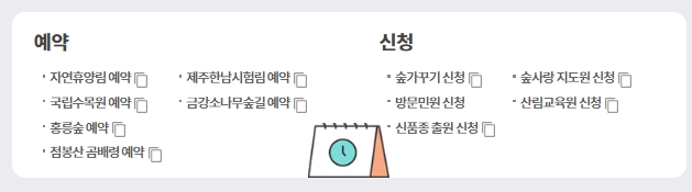 10. 예약 및 신청 메뉴를 확인합니다. 자연휴양림 예약, 국립수목원 예약, 숲 가꾸기 신청, 산림 교육원 신청 등 산림 관련 다양한 예약 및 신청 서비스를 제공하여 국민들이 산림 자원을 보다 쉽게 이용할 수 있도록 지원합니다.