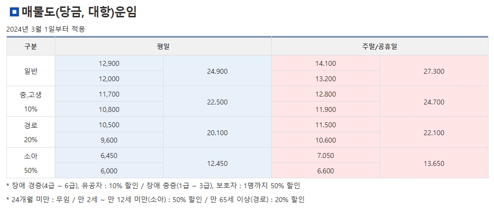 7. 매물도 배편 요금표입니다. 요금은 성인, 청소년, 경로, 소아 등으로 나뉘며, 평일과 주말에 따라 차등 적용됩니다. 성인의 경우 평일 왕복 요금은 12,900원이지만, 주말과 공휴일에는 14,100원으로 증가합니다. 청소년과 경로 할인도 제공되며, 장애인, 국가유공자, 24개월 미만 소아는 추가 할인을 받을 수 있습니다. 특히 경로 및 어린이 요금은 절반 이하로 할인되므로 가족 단위 여행객들에게 유용한 정보입니다.