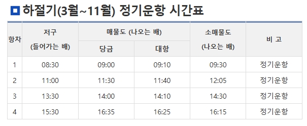 4. 하절기(3월부터 11월까지) 동안의 운항 시간표도 확인할 수 있었습니다. 하절기에는 동절기보다 더 많은 배편이 운영되며, 하루에 총 네 번 운항됩니다. 첫 배는 오전 8시 30분에 출발하여 매물도와 소매물도에 각각 9시, 9시 10분, 9시 30분에 도착합니다. 두 번째 배는 11시에 출발하여 오후 12시 5분에 소매물도에 도착하며, 세 번째와 네 번째 배는 각각 오후 1시 30분과 3시 30분에 출발해 여행자들이 보다 다양한 시간대에 배편을 이용할 수 있도록 되어 있습니다. 하절기에는 여유 있는 배편이 마련되어 여행자들의 편의성을 한층 더 높였습니다.
