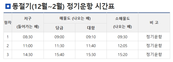 3. 동절기(12월부터 2월까지) 기간 동안 운항되는 배편의 시간표입니다. 저구항에서 출발해 매물도(당금, 대항)와 소매물도를 오가는 배편이 정기적으로 운행되고 있습니다. 배편은 하루에 총 세 번 운영되며, 첫 배는 아침 8시 30분에 저구항에서 출발합니다. 매물도에서 당금과 대항에 각각 9시, 9시 10분에 도착하며, 소매물도에는 9시 30분에 도착하게 됩니다. 두 번째 배는 11시 30분, 마지막 배는 오후 2시 30분에 출발하여 각각의 섬에 도착하는 시간은 정해져 있습니다. 이용객들은 각 섬에서의 체류 시간을 고려하여 적절한 배편을 선택할 수 있습니다.