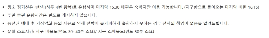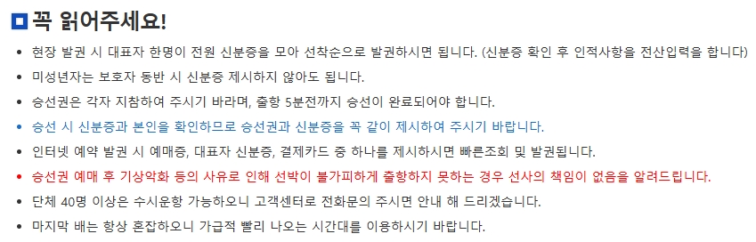 9. 마지막으로 운항과 관련된 필수 공지사항입니다. 현장에서 발권 시 대표자 한 명이 전원 신분증을 모아 선착순으로 발권하며, 기상 악화 시 출항이 불가할 수 있다는 점도 안내되어 있습니다. 승선 시 신분증을 제시해야 하며, 미성년자는 보호자 동반 없이 승선할 수 없습니다. 배편 예약 전 이러한 사항들을 충분히 숙지하고 준비하는 것이 원활한 여행의 필수 조건임을 다시 한번 강조합니다.