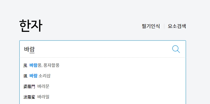 2. 원하는 단어나 발음을 검색창에 입력해 보세요. 단어의 의미와 함께 여러 한자들을 보여주는데요, 예를 들어 바람을 검색하면 다양한 한자가 나옵니다. 바람을 의미하는 풍 외에도 다른 뜻을 가진 여러 한자들을 비교해 볼 수 있습니다.