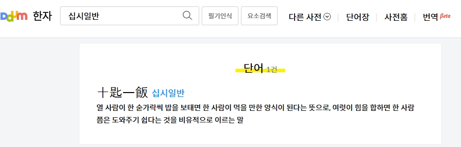 1. 다음사전으로 들어갑니다. 다음사전은 다양한 어휘의 뜻과 그 유래, 활용 예시 등을 제공하는 사전으로, 한국어 어휘에 대한 깊이 있는 설명을 확인할 수 있습니다. 여기서 십시일반이라는 표현의 의미를 검색하여 관련 정보를 살펴볼 수 있습니다.